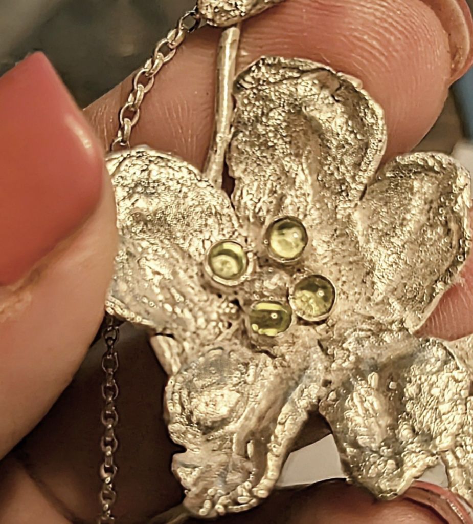 Her Peridot escaped as she was finishing a necklace. Not in the normal run of things a big problem but she was tweaking the night before she was due to deliver her work to me and then fly off to Greece.