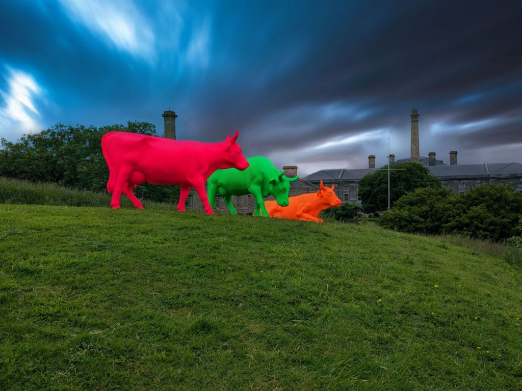A day of transforming a yard from off-white to white turned out to be both extraordinarily colourful and a self-limiting occupation. The colour change can be seen just by the O of off-white. The early morning dog walk set the colour bar high when I noticed that the luminous cows had moved.