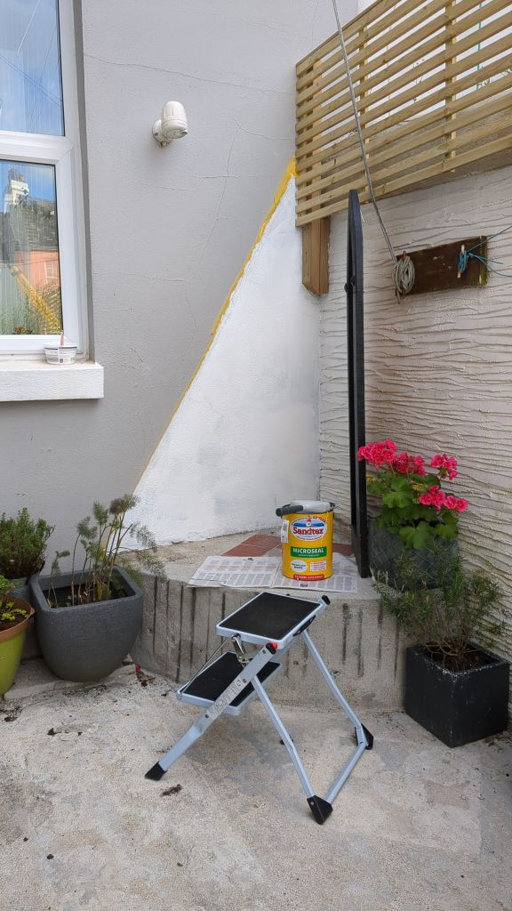 Another day, another paint pot, another direction. I had no idea how to paint one section of the yard walls. Complicated by mixed surfaces and under colours. I decided to use colour blocking , beloved by interior designers. Who knows how that is going to work out.