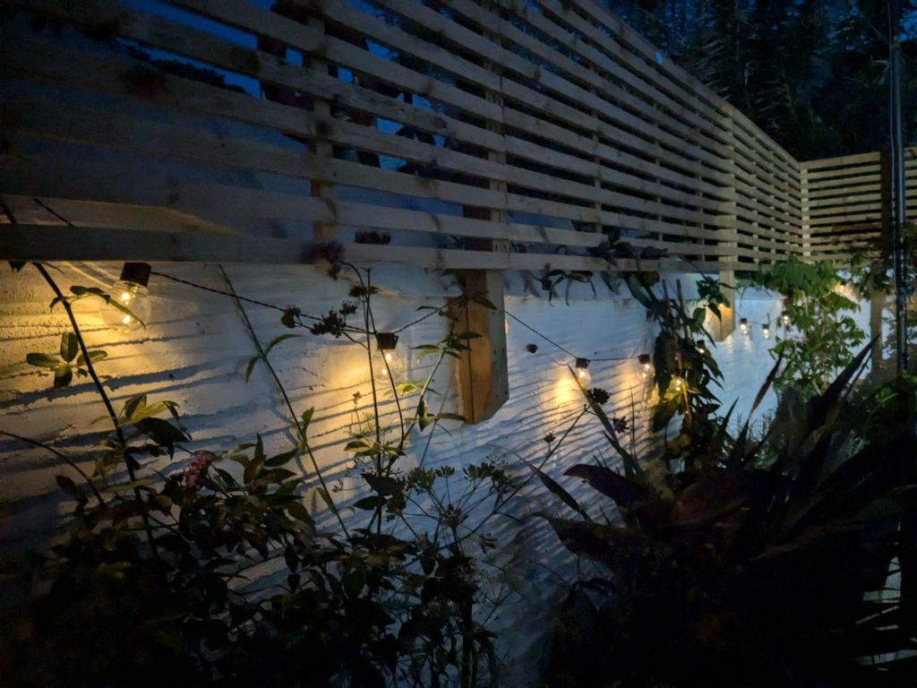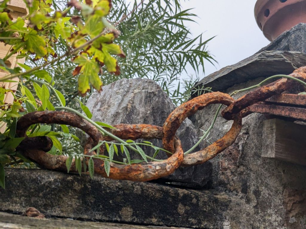 And the wisteria is finding her way along the chain rescued from the sea.