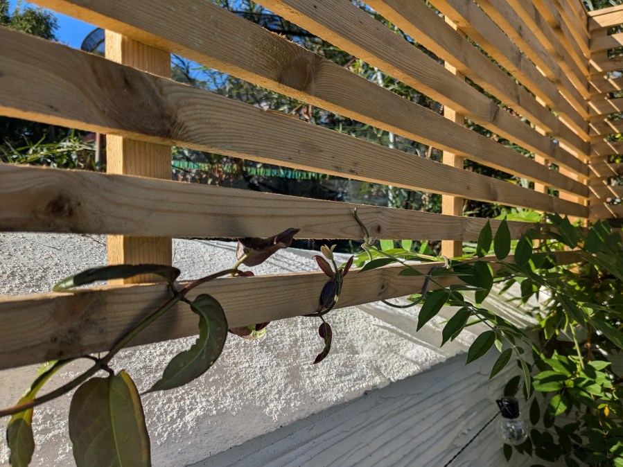 But today is all about a plan coming together. 3 months after the new trellis went up on our wall our climbers are getting acquainted.