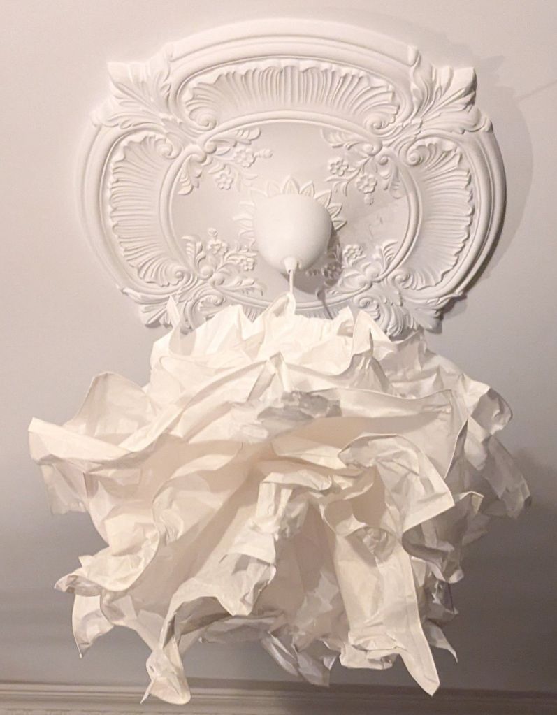 Yesterday we replaced two of our chandeliers with crumpled paper light shades.
