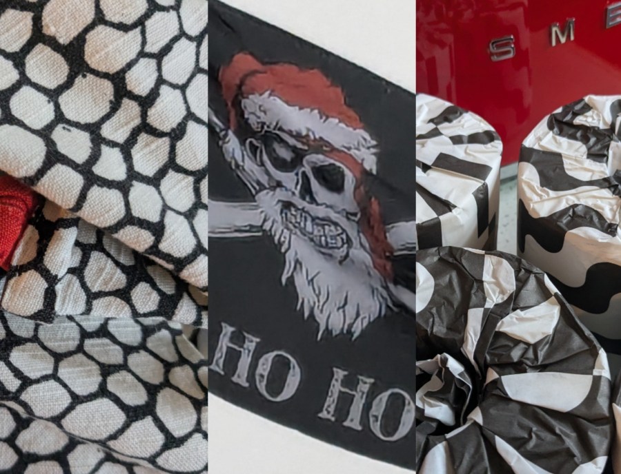 Pirate Santa eloquently shows the difference. West Country Greige is back this morning. He also sets the monotone ( with a pop of red) of my day.