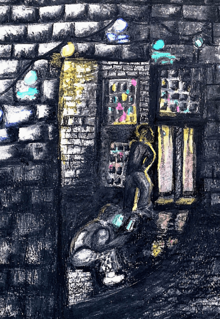 A man takes a pee in a back street. Illuminated by the lights emerging from a pub. It could be an image from anytime in history except the second figure, a cook on his break, is illuminated by his mobile phone.