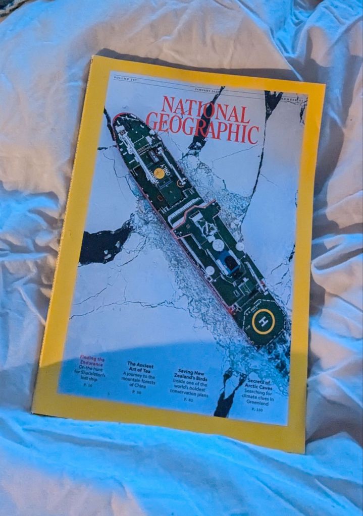 I discovered this new blue plaque about 1/2 a mile from home a few weeks ago. Over the Christmas period a late birthday gift from my ex-husband arrived. A subscription to the National Geographic magazine. The front cover story was the discovery of the Endurance.