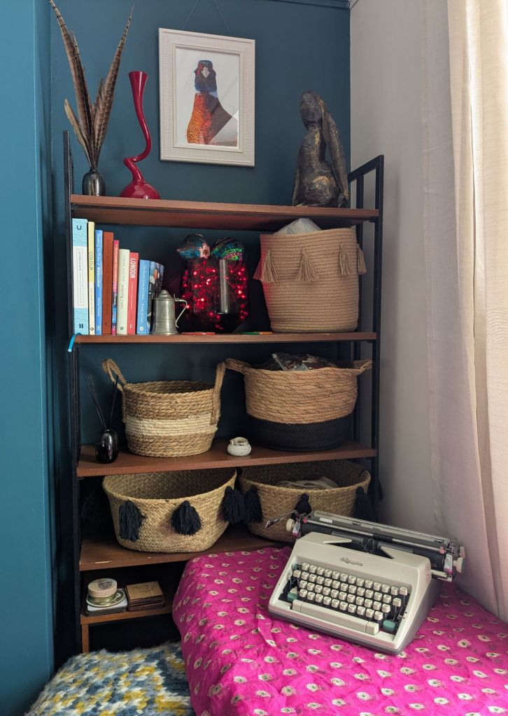 As an aside to all this, my workspace is finally finished. It has taken us 6 months to find exactly the second hand furniture we needed to store regular life and art materials. We never intended bright pink to be an accent colour but an old sari is the perfect cover up for works in progress on the table, and my lovely old typewriter is just the perfect shade of beige.