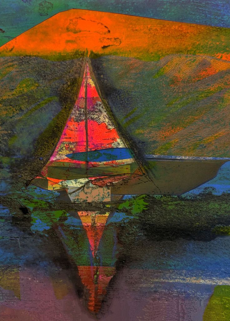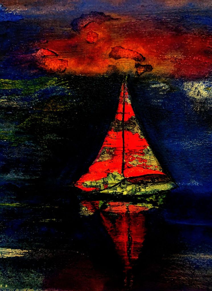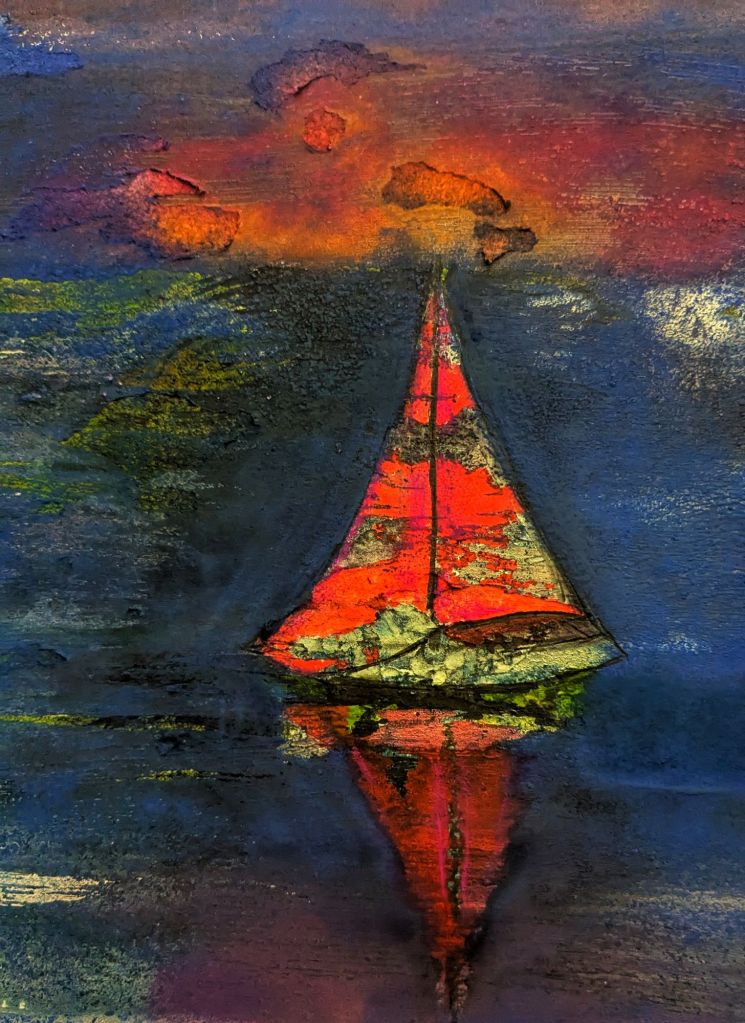 This image is a bit of everything, gelli printing, collage, watercolour and pastels. Under such pressure many papers would fail and this one was no different. But the failure, where the surface pulled off is almost its greatest success. The orange area above the boat got a bit too wet in the process and the surface started to lift off. Working into the area with pastels created the cloud texture.