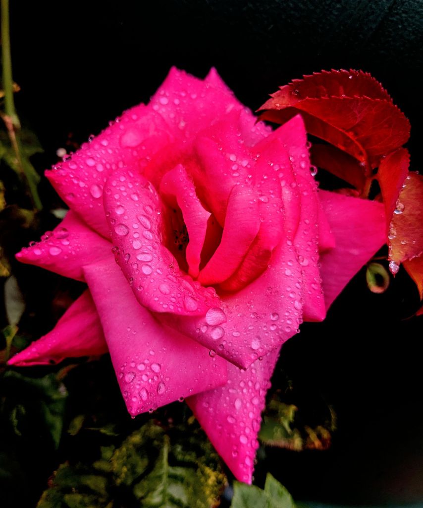 Yesterday it rained and a scrappy old rose that persists in the tropical bed in the yard put on quite the show against the water butt. I am not quite sure why we allow the rose to continue. A misplaced belief that it marks the spot where someone unknown, a previous owner of this house, had buried a beloved pet. It is a very old gnarly thing that has survived against the odds. It blooms throughout the summer, but not really in a meaningful way. The buds are neat and a fresh bloom can be beautiful, as this one is. But within a day the flower will open fully and fall apart. Just looking tatty and ugly.