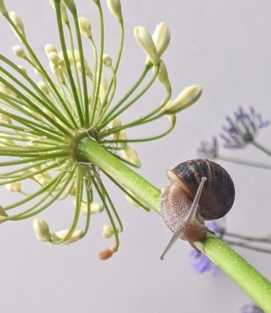 Balance was certainly on the mind of this snail who really had no need to take himself along the yard-long stalk of an Agapanthus. Snails do not eat Agapanthus blooms.