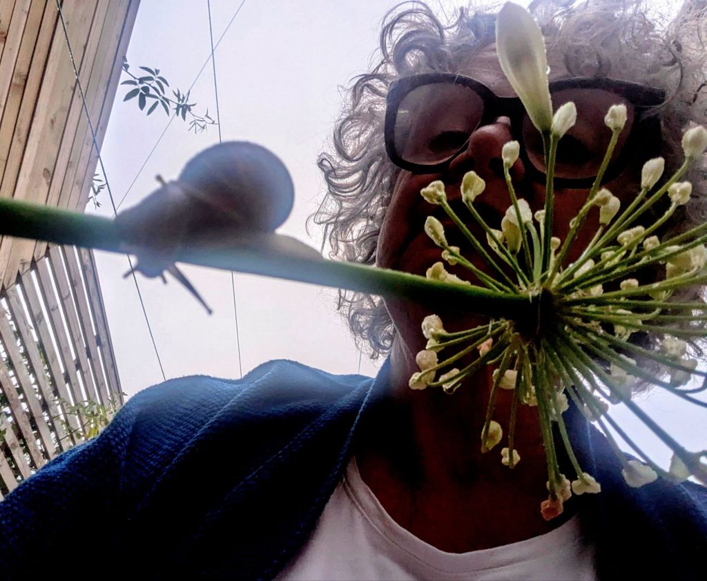 Woman and Snail, both doing a balancing act.