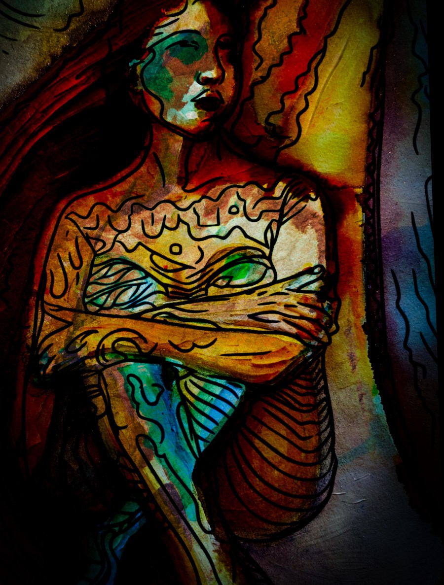 But that was all a bit flimsy so I traced over my quick sketch and then did some mark making in response to the actual sketch and with some reference to Tretchikoff ‘s fabulously ornate collar. Tricksy on someone who is naked. I also wanted just a scintilla of sadness. The loss of creative spaces is a somewhat sad and mournful moment.