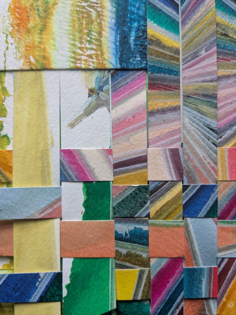 I chose this one because my very wet evening walk reflected light on cobbles reminded me of this technique of woven collage.