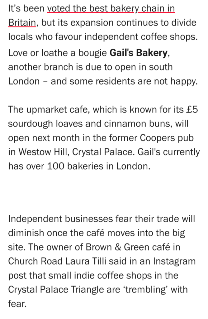 Now I love an Independent business, one of the many reasons we chose to buy a flat in Crystal Palace. But living in London requires almost everyone to work very long hours. I often caught the first train out in the morning a full two hours before any independent bakery opened. I would return 12 or more hours later when any self respecting independent would have sold out and closed up. My independent loving heart would have been starved of baked goods were it not for Gails. A freshish sourdough loaf at 7pm is better than a sold out and closed for the day independent. And infinitely better than anything a supermarket could serve up.