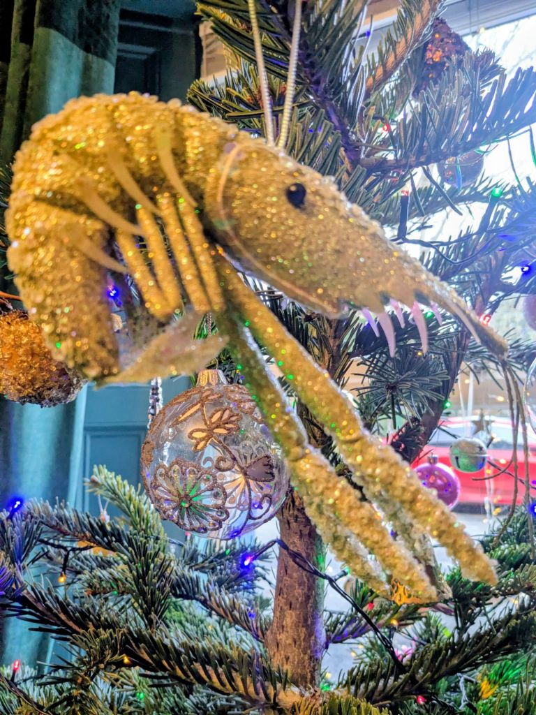 One Southern Hemisphere bauble made it into our suitcases. Somewhat loosely described as a bauble, a glittering pale green prawn hangs happily on our Christmas tree.