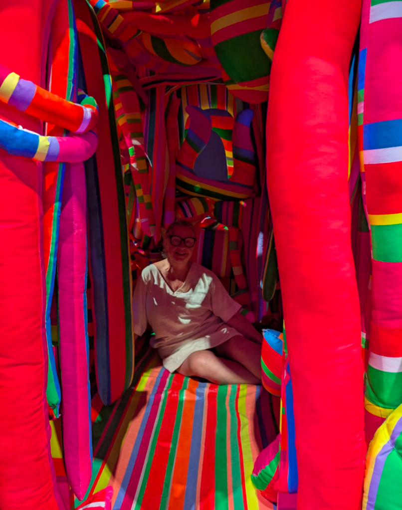Caught in a shaft of sunlight. My sunlight promise of some sunshine every day in January would not ordinarily feature art. But here I am within an art work by Marta Minujin. Part of a collective of Womens Art that we visited in Hong Kong.