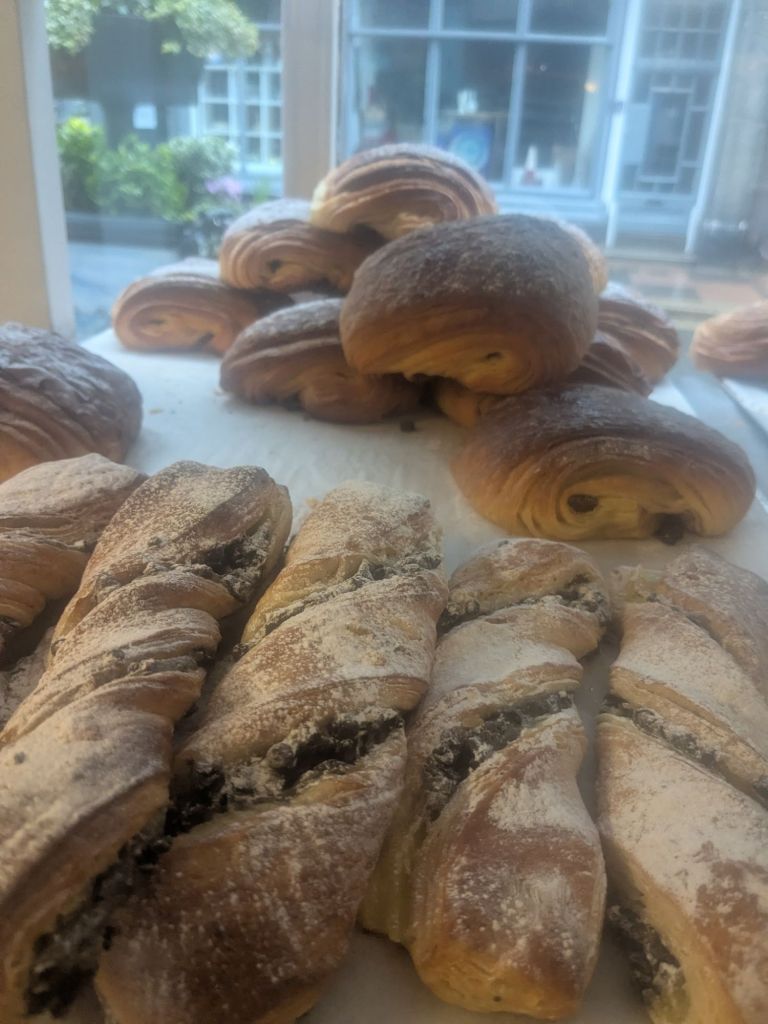 She was determinedly asleep when I suggested getting a warm, from the oven , chocolate croissant from our local bakery to make a wet Sunday morning a little more tolerable.