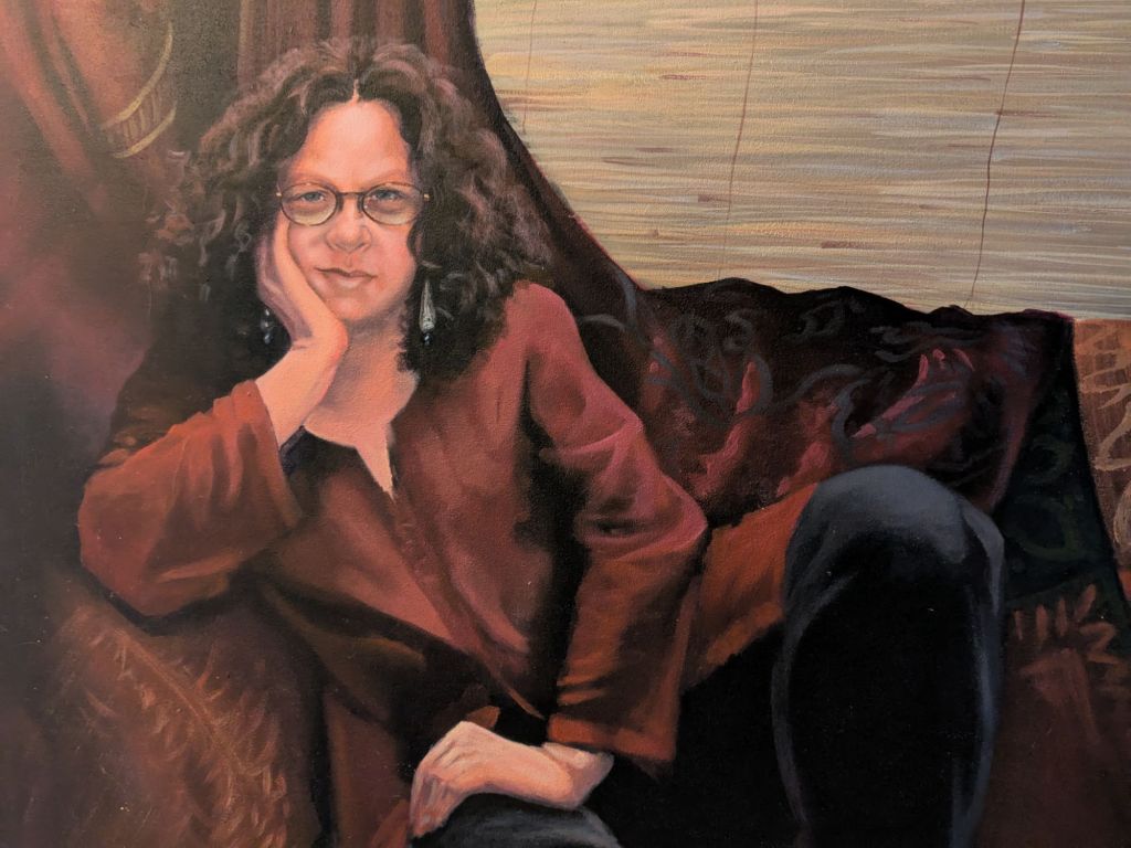 Before loading the garage with summer paraphernalia I collected a stored portrait. A friend and I plan to have a good old natter about the experience of having our portraits painted. My two were painted 10 years apart and I have never before viewed them together.