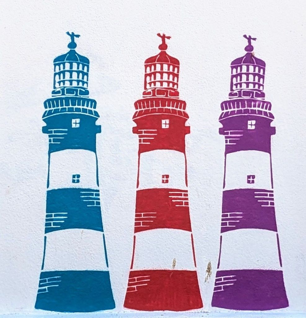 Much more contemporary was some nearby graffiti. 3 of 9 multicoloured Lighthouses stencilled on a wall.