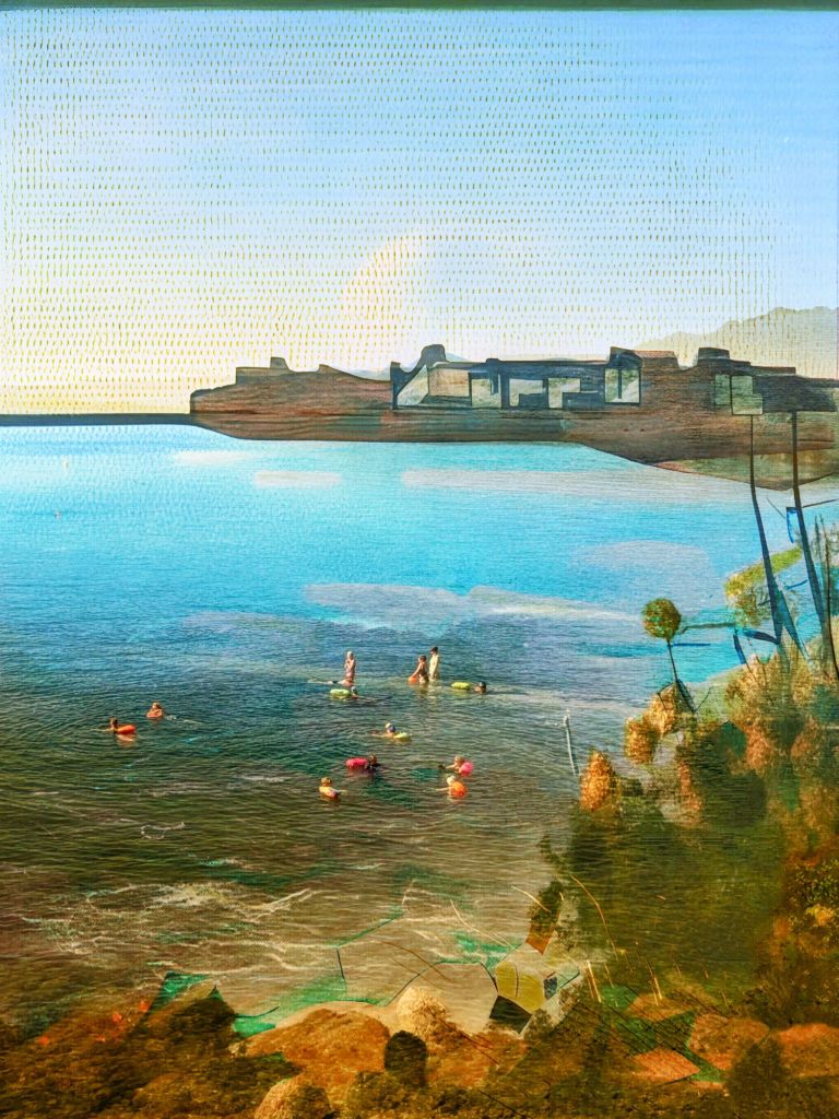 Creatively, I am embedded in a pre-1820s Plymouth. Trying to imagine life in my local neighbourhood as JMW Turner would have seen it, but also wanting to include contemporary aspects that would have been unimaginable and crazily futuristic to him. My normal life goes on around my creative thinking. When working in the studio radio and the dogs are my constant companions. The Work in Progress above is a concatenation of yesterday’s studio time. Apparently, mid-May is when semi-sea swimmers return to the cool waters around the British coast. Yesterday was named by the BBC as Dippers Day.This information was a news infill on the radio station I was listening to. A semi-sea swimmer only partakes May to September.