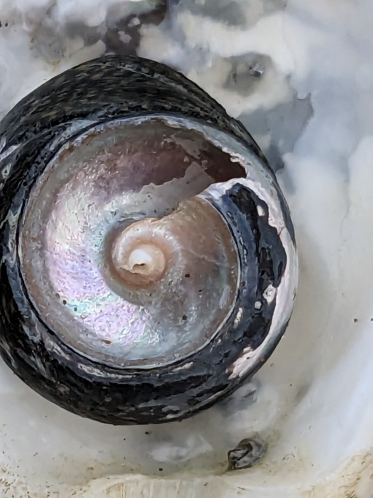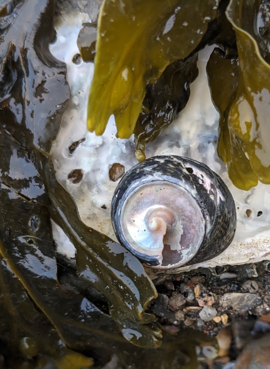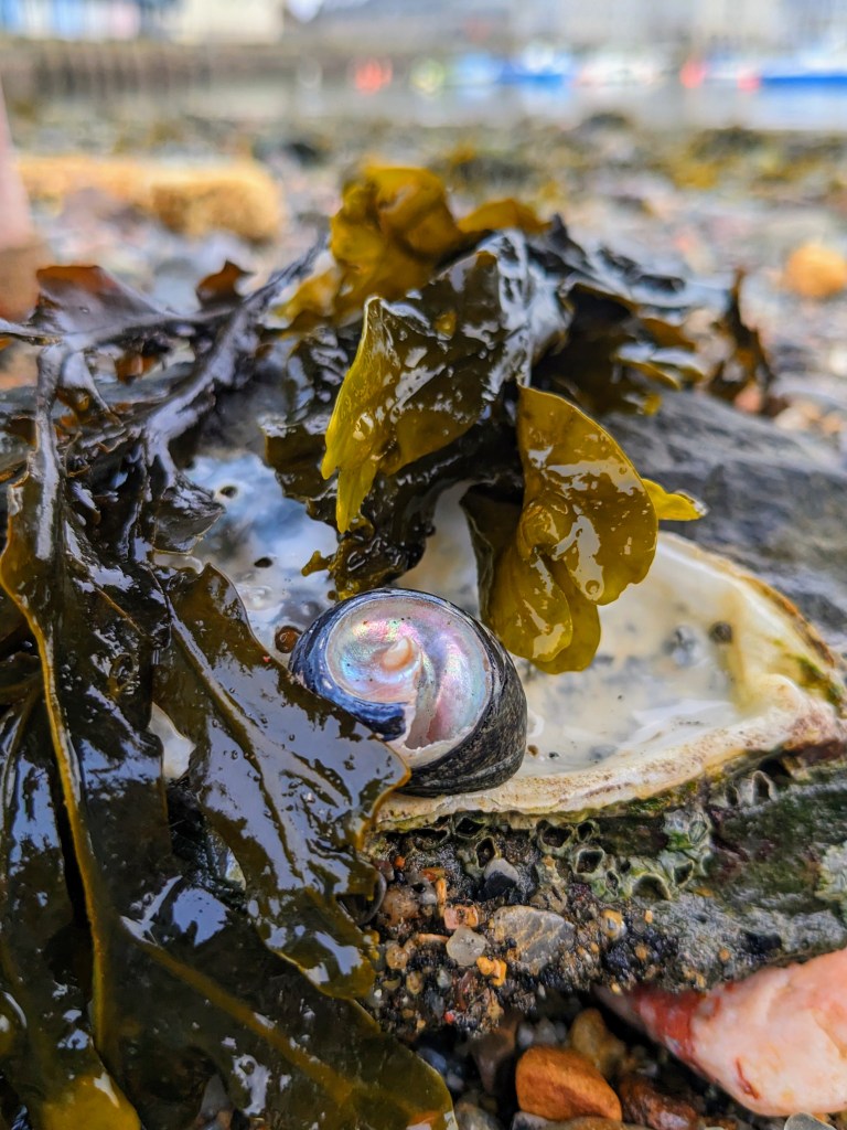 Anyway, however gloomy it was yesterday, a little arrangement of sea debris caught my eye. A broken periwinkle shell, an oyster encrusted on a rock and some foraged, by Hugo, seaweed.