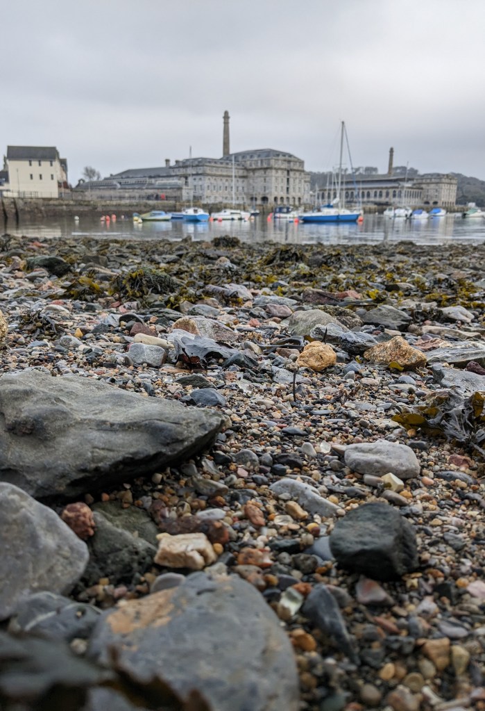 I almost never photograph this beach at low tide. On the opposite side of the peninsular to our swim beach, it faces the Hamoaze, a broad section of the River Tamar as the river meets Plymouth Sound and then the Ocean. Centuries of old industrial stuff washes up on this beach from the dockyards, one of which, no longer an active dockyard, is in the background of this shot. Hugo could spend hours here, rescuing seaweed from the waters edge. Lola is less enthralled, as am I, particularly on a gloomy day. However there is often some quite fancy sea glass, my pockets often return home with a few little glass triangles of ‘ Pirate Treasure’ . The washing machine engineer takes a dim view of ‘Pirate Treasure’ in the filters. Evidence that I am not a diligent pocket emptier.