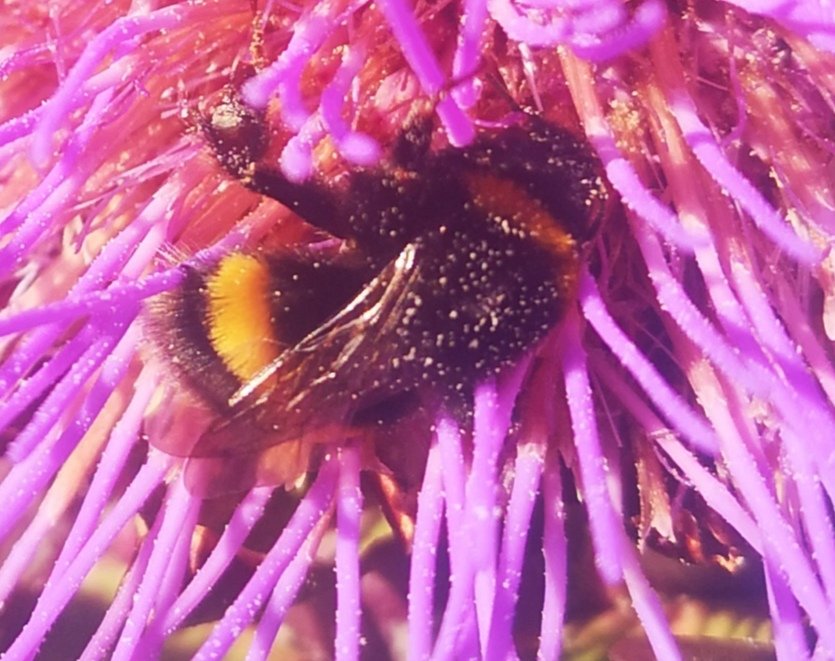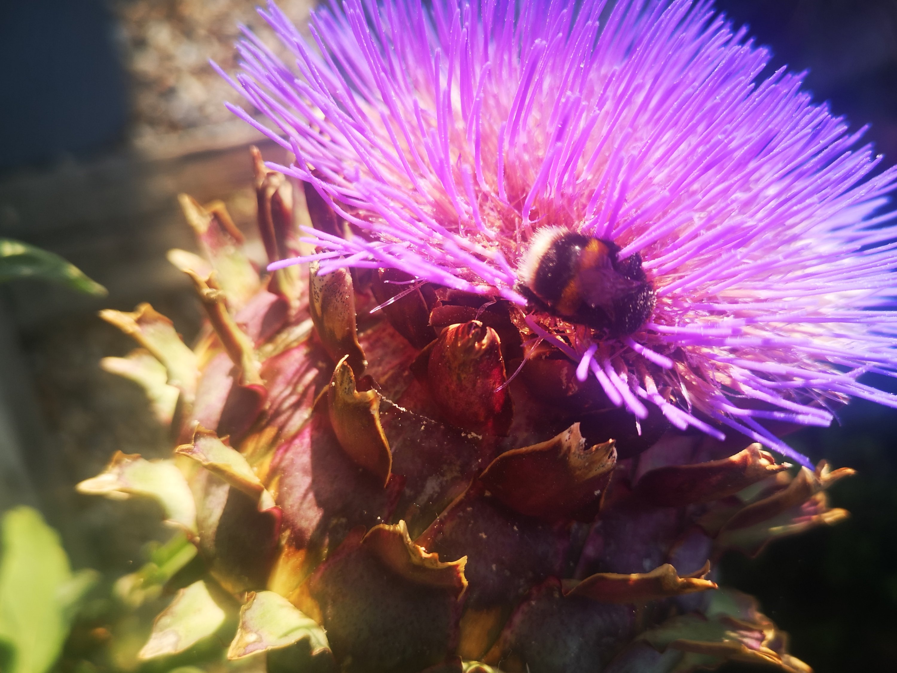 Today is the day in our corner of South East Cornwall. The Artichokes have burst forth their pollen coated flowers and bees are all over the place, apparently this is a buff bottomed bee. There were many bees of buff bottom fame.