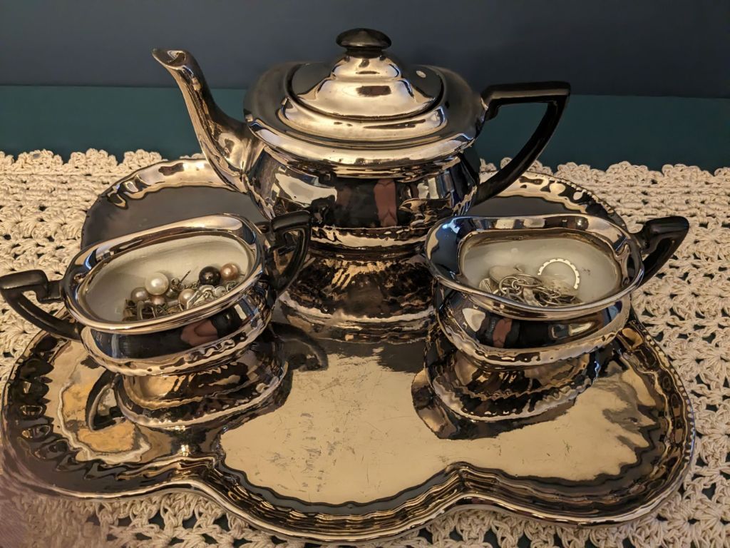 Both items were reduced in the sale. The tea set was £5 and the jumper £4. The upholstery job took exactly one woman hour. The earring gathering may take a little longer.