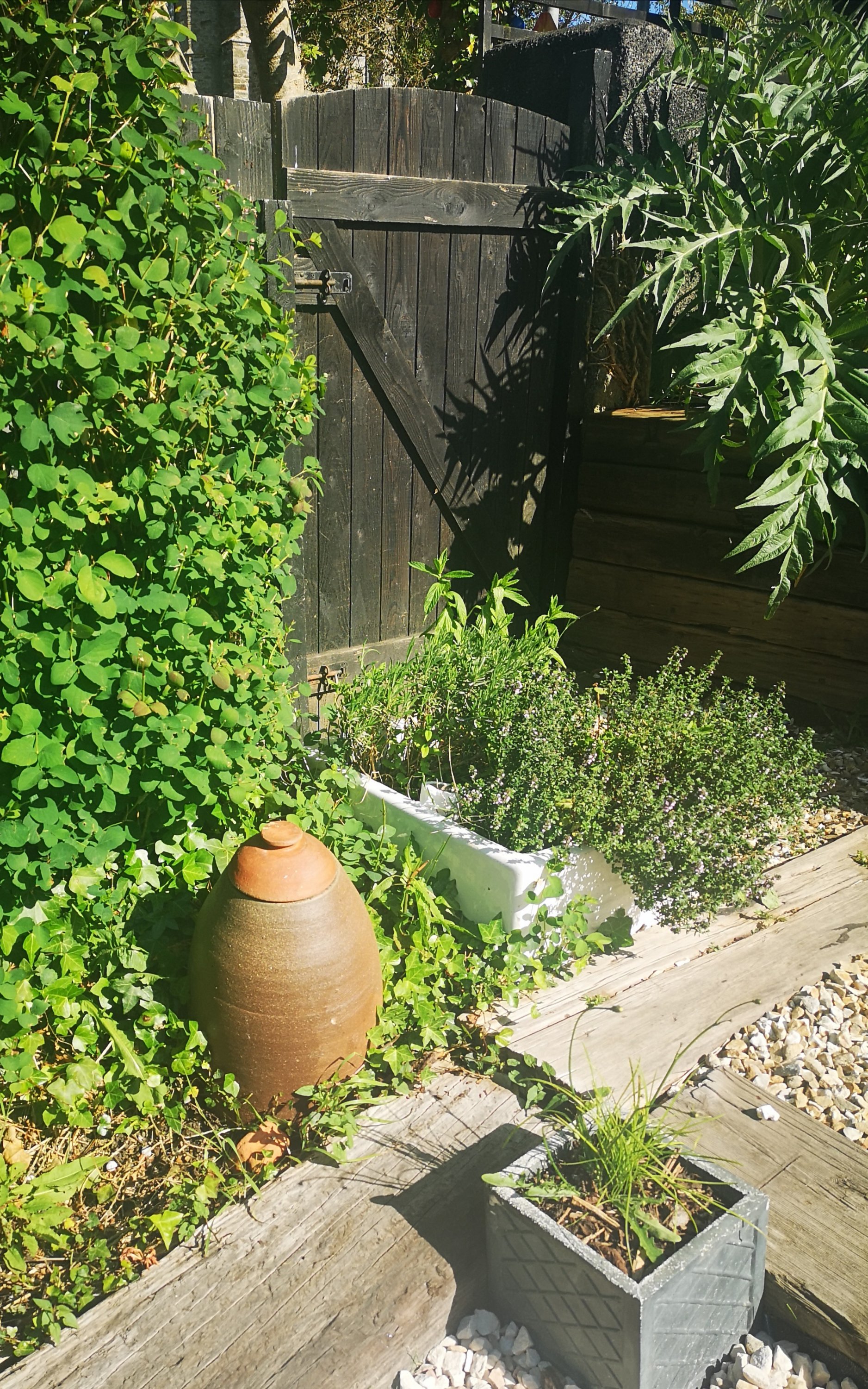 We were at the garden centre on a double mission. To replace a couple of casualties from the move and to avoid very heavy Cornish rain. We had also spent some time at an EcoLodge over the weekend and were freshly charged with sustainable ideas.