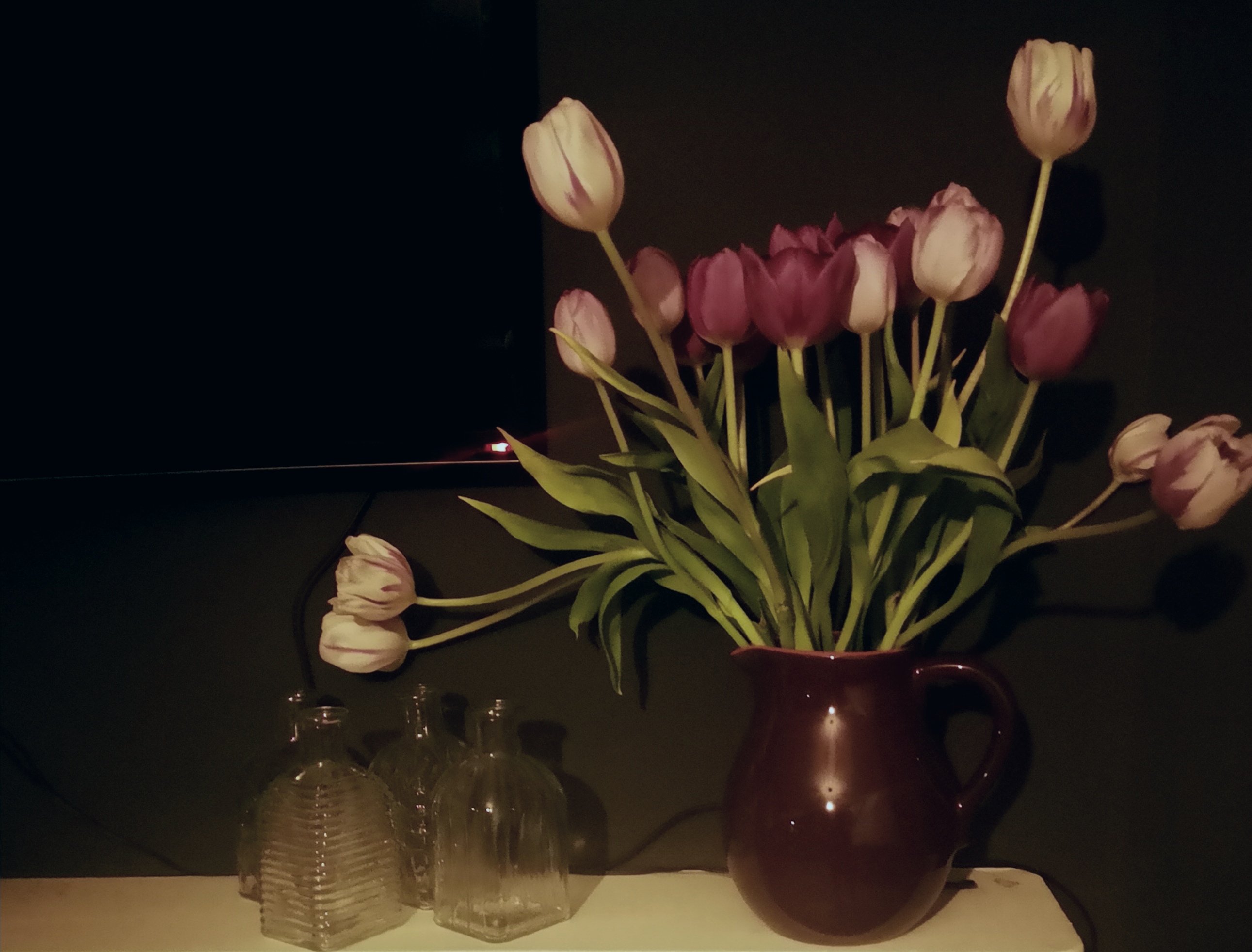 Gardening has become a routine but we are fast running out of places to store lawn cuttings, bush trimmings and weeds. It is weather related rather than supply and demand which governs shopping. Storage of garden waste is soon going to be the factor that controls us. The weather flip opposite of the gardening routine is interior DIY. It’s amazing how much we can achieve just by using stuff we already have in our shed.Curiously Mondays have become our laundry and house cleaning day. This is exactly the routine my grandparents had and it’s one that has crept up on us. In non pandemic times we washed whenever there was a load but with no life beyond home we are producing less washing. House cleaning is not so bad when you are not exhausted from working elsewhere, I can only think of two pre-pandemic routines that we’ve not modified. One is the bedtime walk for the dogs, we never meet anyone even in normal times and that’s not changed, people don’t whizz past us in their cars anymore . No cars means no pollution and what is noticibly more lovely about our evening walks, this spring, is the intensity of fragrance from people’s gardens and the hedgerows.The other unchanged routine is having flowers in the house. The weeks of daffodils have passed and currently we have tulips.