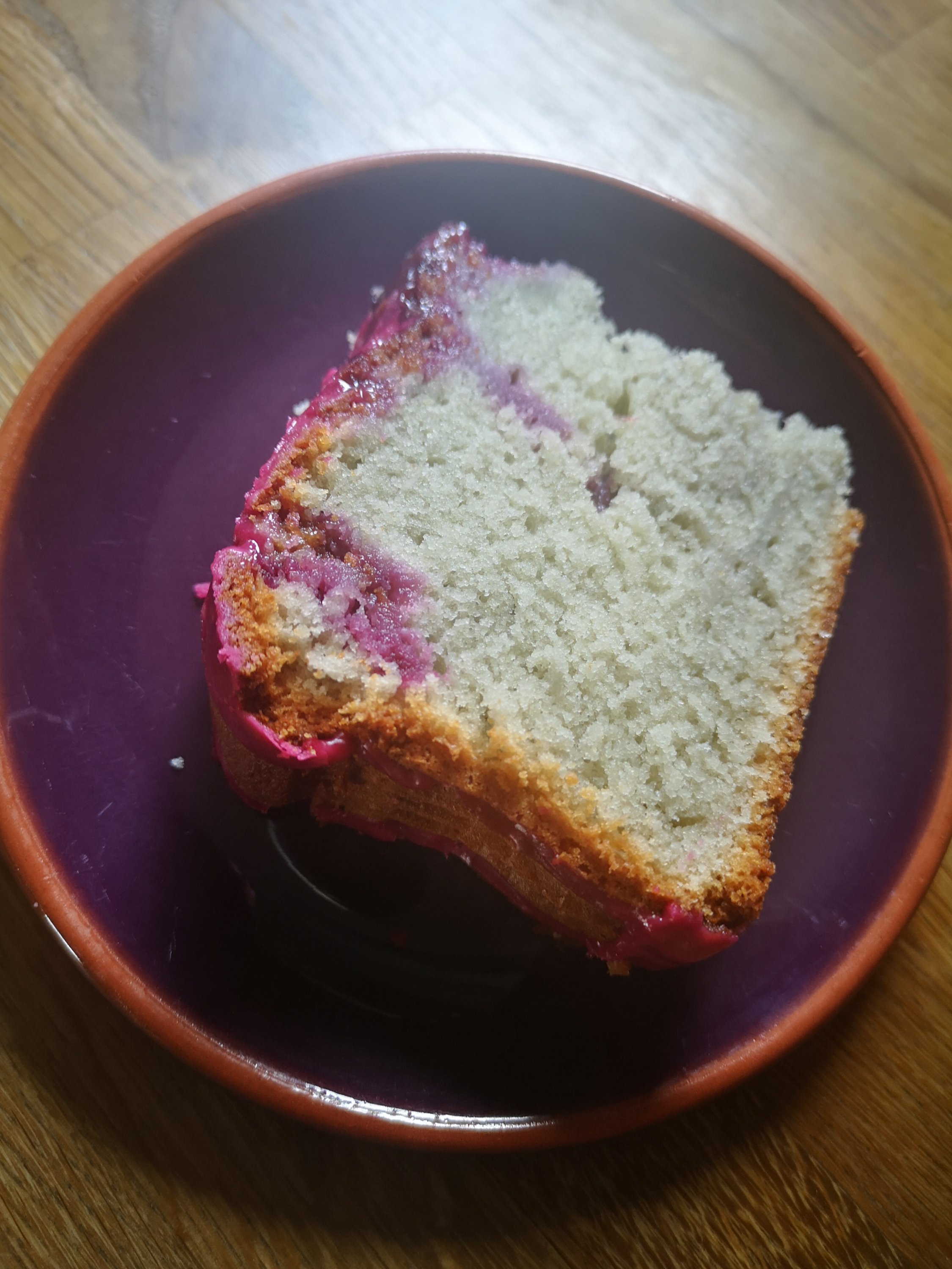 Todays cake is the most bodacious looking . Puce pink icing and deep blacky purple drizzle. It would be wonderful, but the small amount of blackcurrant juice added to the cake mixture has changed the colour of the cake just slightly bluey green. Useful for a sea monster but not so lovely for afternoon tea style cake.