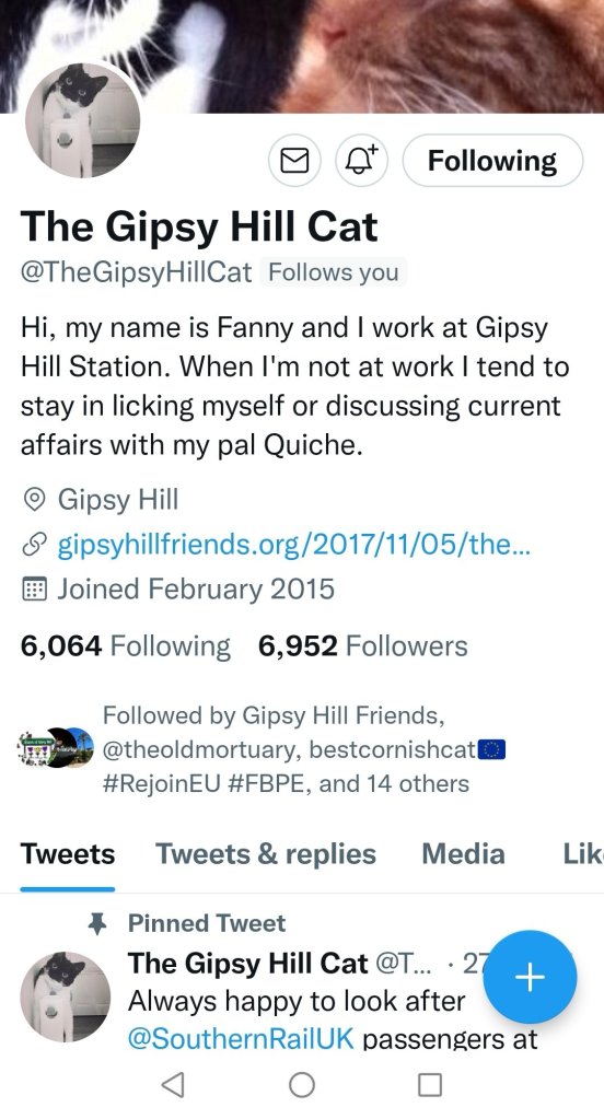His cat Banjo was perplexed and intrigued. Banjo is a Gipsy Hill cat but not ‘ the’ Gipsy Hill cat.