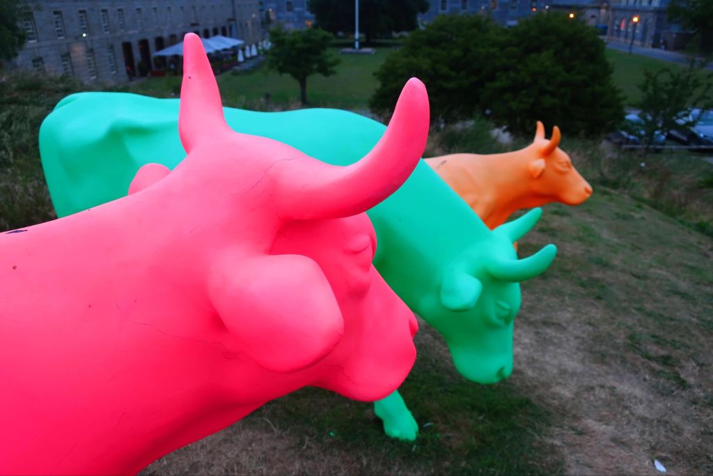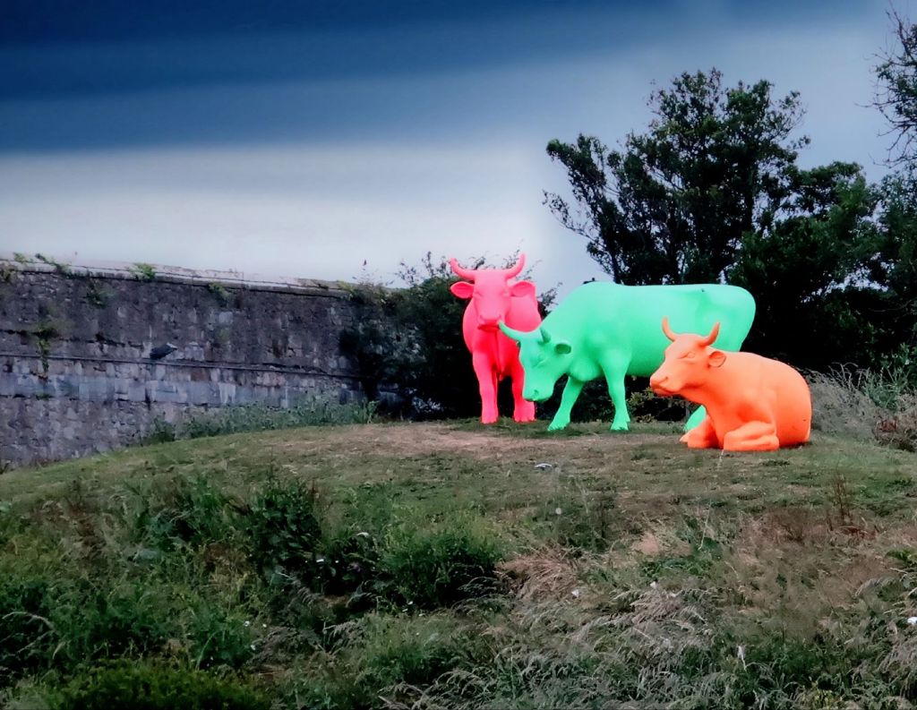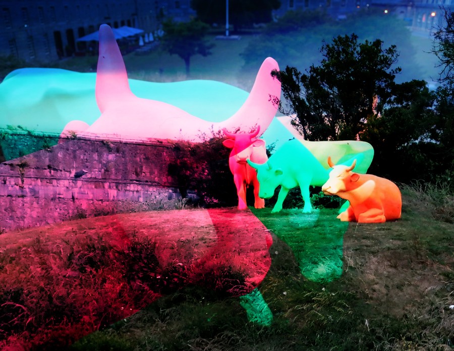 Our fluorescent cows have only experienced one music festival in the Royal William Yard. I was writing for a local arts magazine so we had some press passes and had the most wonderful time buzzing about. Such a shame it only happened once. A casualty of the hiatus of the Covid years. I suspect having only happened once there just hasn’t been the impetus to get it going again. I do rather like the freedoms that a press pass allows. Imagine having one for Glastonbury. That would be a giddy few days of blogging, apart from the cows of course , which are stultifyingly normal.
