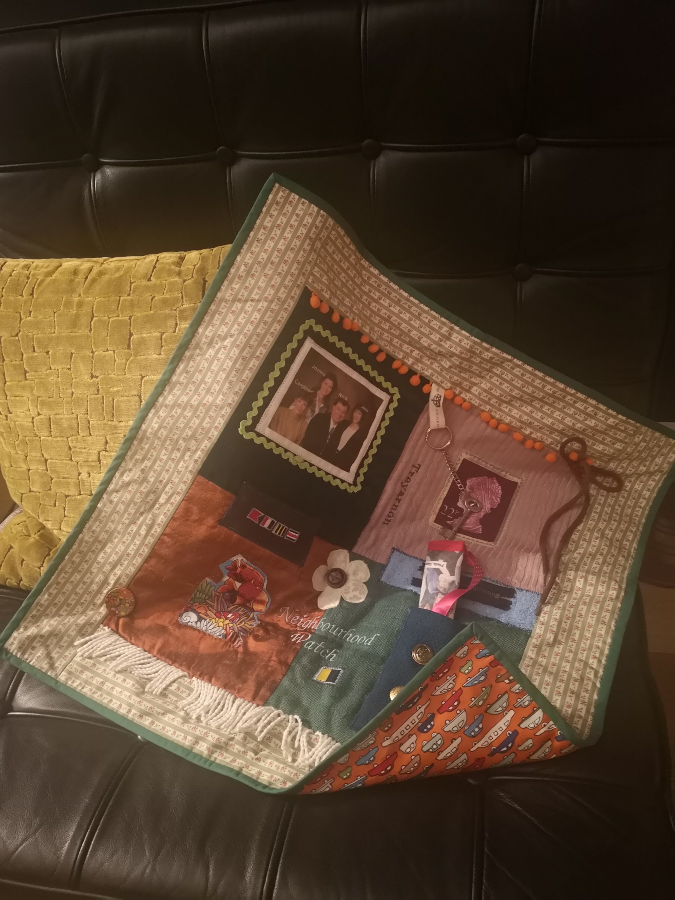 So much more than stitchery goes into every creation. Mrs Marvellous has had personal experience of both dementia and loss, but beyond that she is involved with Plymouth Dementia Action Alliance. She says Plymouth is a hotspot of dementia innovation and research. She advocates the need for protection of pride, respect and dignity for those living with dementia. Her lap quilts and aprons are designed to keep people warm and engaged, with pockets, textures, familiar fabrics, perhaps samples that are representational of their old life and loves. A brilliant techy addition to the magic of the creations is a tag sewn into its own pocket.