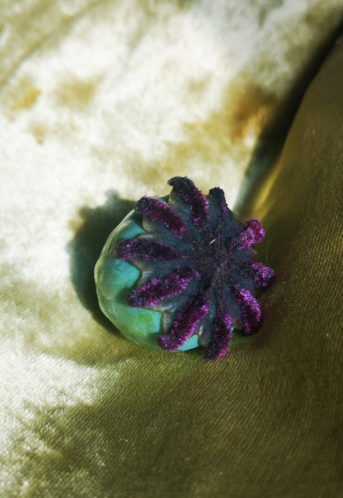The glorious poppies of late spring and early summer, much loved and instagrammed by our neighbours during lockdown are long gone but one lonely little seed pod came indoors with me today and nestled in a sunbeam on a velvet cushion.