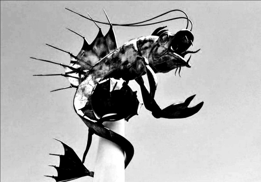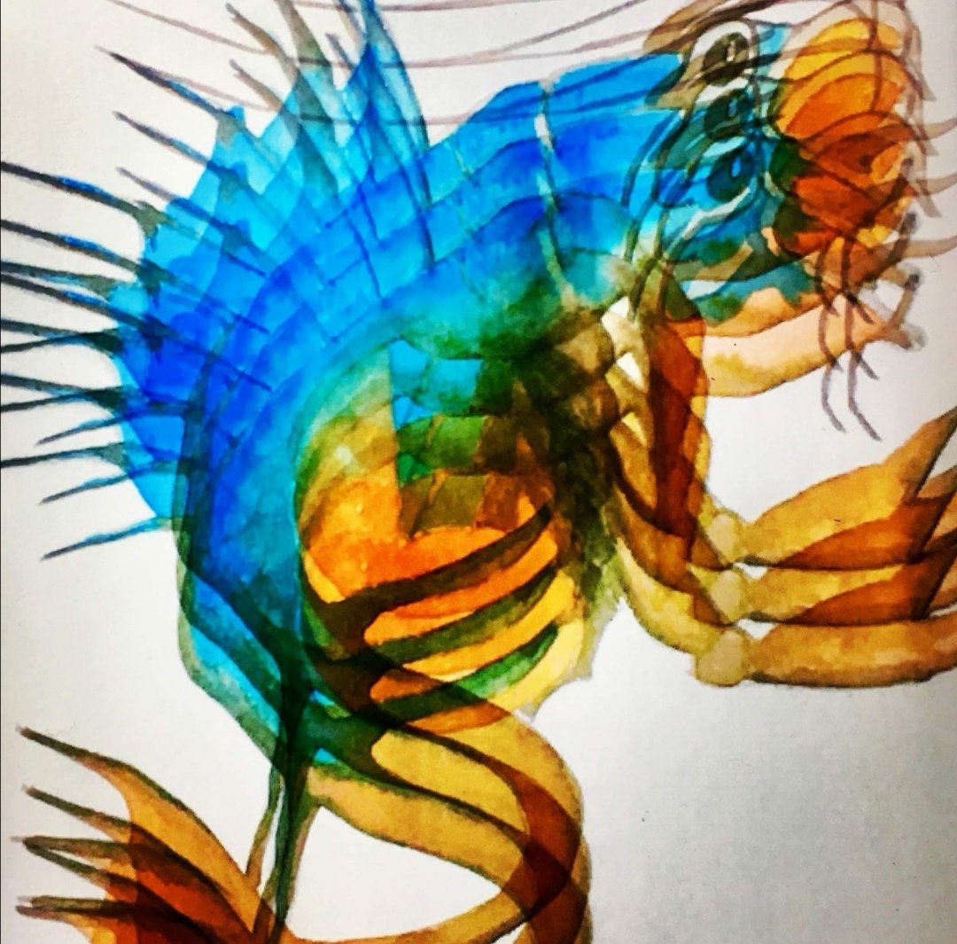 The Leviathan is a prominent sculpture, by Brian Fell, situated on The Barbican Plymouth. Locally it is known as the Plymouth Prawn . The Leviathan is set to become famous Worldwide as the Mayflower400 celebrations build up in Plymouth. The Leviathan is close to the commemorative Mayflower Steps.Leviathan has its own Twitter account , not that it’s particularly active or has many followers. Strange really. Leviathon lives in a lively location.Leviathan was installed in 1996 and is made of patinated steel. Leviathan is a sea monster created from regular sea creatures. Cormorants feet, the fins of a John Dory ,the tail of a plesiosaur, lobster claws and the head of an Angle fish. Despite this callaloo of body parts Leviathan is majestic.The Leviathans location is on one of my regular dog walks. There is a fabulous circular walk around the harbours and quays of Plymouth taking in both historic and contemporary port buildings and activities. I’m tempted to photograph the sculpture almost every time I see it , sunshine is the very best weather for Leviathan snapping, not unlike life really.I used the fishy subject for a watercolour subject, minus the drumstick! Although a competent image of a skewered Leviathan kebab eludes me.A little bit of printing magic and I’ve created a psychotropic Leviathan. At night The Barbican is nightlife central. Who knows if the Plymouth Prawn partakes.And then just one little move to create a completely abstract image with no hint of sea creatures.Not such a romantic blog as the date would suggest but to my regular blog readers a simple message, thanks for all your comments and feedback.This blog is linked to a social media Instagram project. The prompt for today was #valentinesdaynohearts.https://drawntothevalley.co.uk/I believe Leviathan has a heart. It just needs to find its Sole Mate.