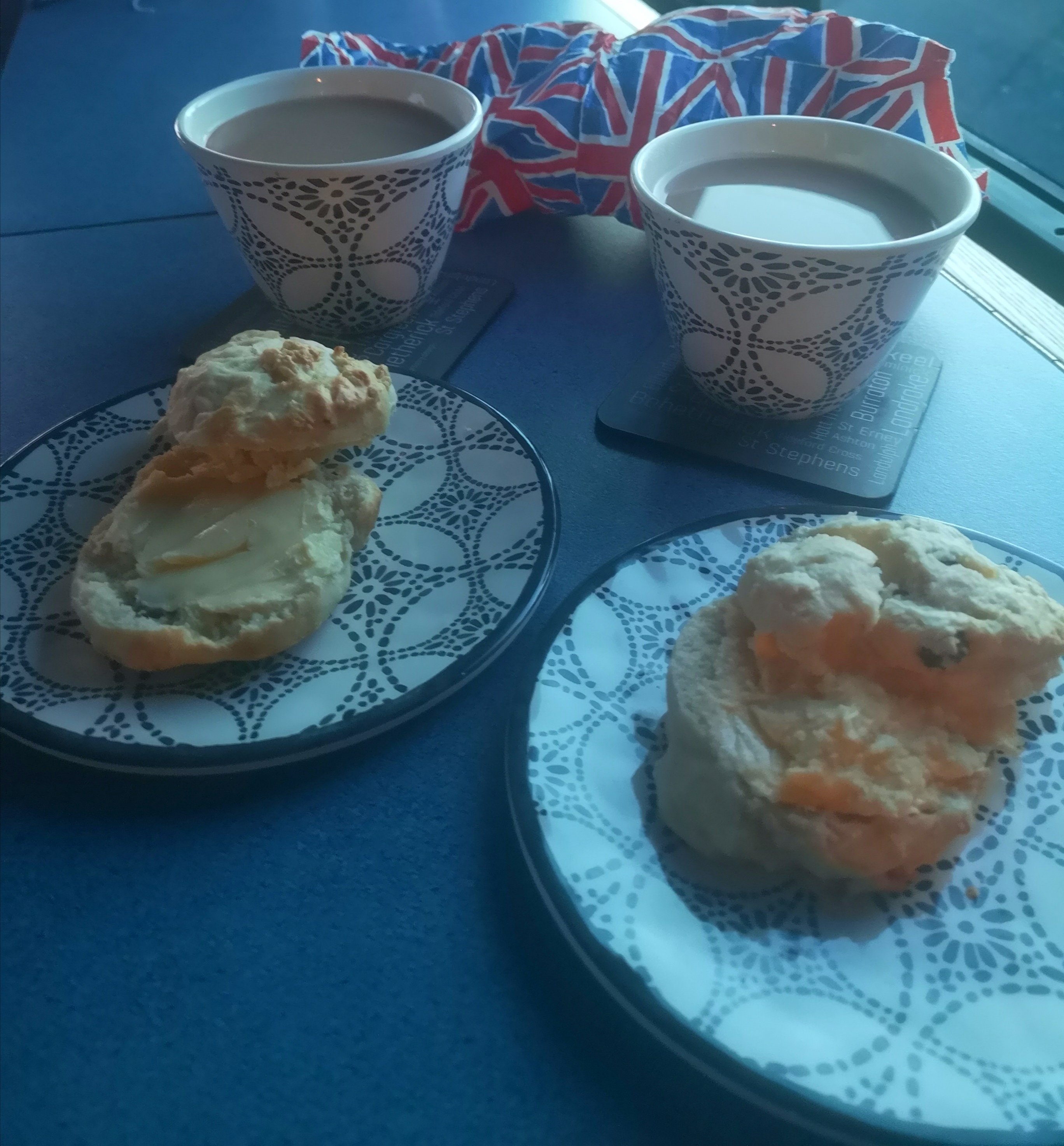 Apart from garden chores, we had no great plans for today. VE Day has written this late edition itself. The day started, as they all do, with a Joe Wicks Work Out.The picture below was taken during the two minute break between exercises. The dogs love Joe Wicks, the cans are our improvised dumb bells and the velvet cushion , an item that should actually be in every gym, is a great asset for the kneeling exercises. Out of shot are the cake plates.