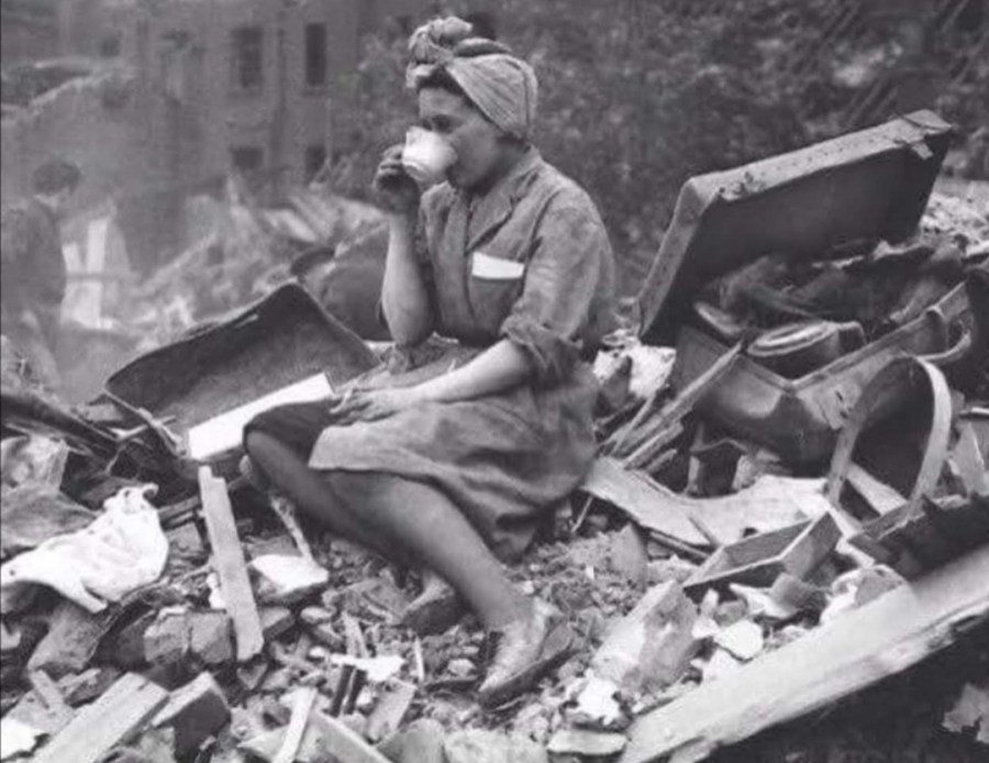 Sunk into the earth where they, the Beatles, relaxed in the sun before their gig in Plymouth in 1967. The moment preserved by an iconic photograph.We finished the day with a cup of tea and a scone. The scones were traded to us by a neighbour for the loan of our hedge trimmer.A cup of tea is a fine way to end a blog on VE Day. The last image of the day is my favourite WW2 picture from the South West Image Archive. The Archive is held by The Box, Plymouth and is of a woman, drinking tea while sitting on the rubble of her destroyed home near Plymouth Dockyard,