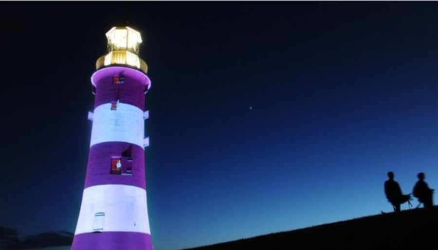 Smeatons Tower on Plymouth Hoe turns purple in remembrance of those who lost their lives on Thursday.