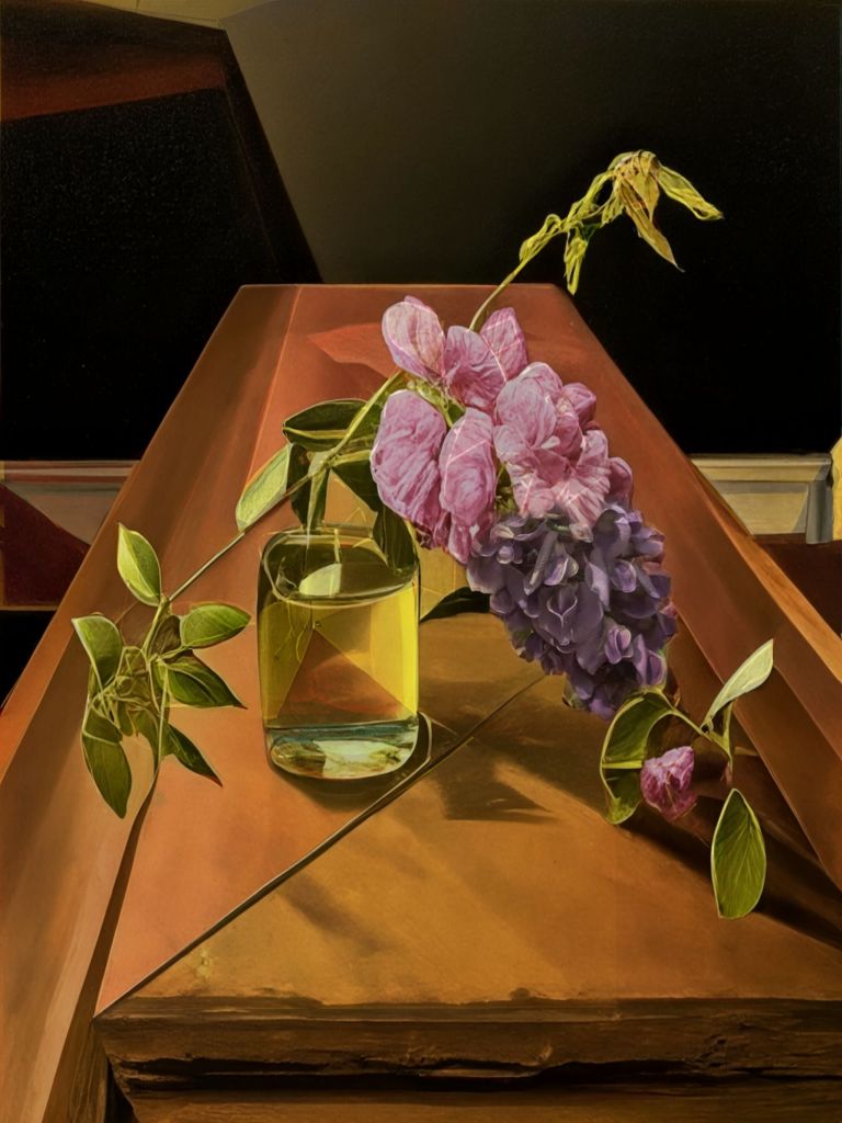 Last year we missed the most dynamic part of the growing season so none of the climbers bloomed with anything more than the short lived flowers they arrived with. This year, the first where they have had almost a full year in our care they are all slow to get going. But first a climbing rose and now the Wisteria are putting out flowers. Just as the first rose bloomed its stalk became too weak and it was rescued to live a brief life in a shot glass. Yesterday the first wisteria bloom snapped off the plant and has been rescued into the kitchen, this time in a milk bottle.