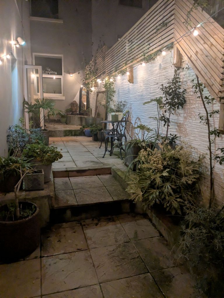 The first early darkness of GMT in the studio/work room. We have installed winter lights. 4 years in, living in this house, and the yard is where we want it to be. Even last year the yard did not spark joy when illuminated in winter but the curious weather of 2025 gave us an enormous growth spurt of our container and climbing plants from September until now. We picked a fresh strawberry yesterday and there are still tomatoes ripening.