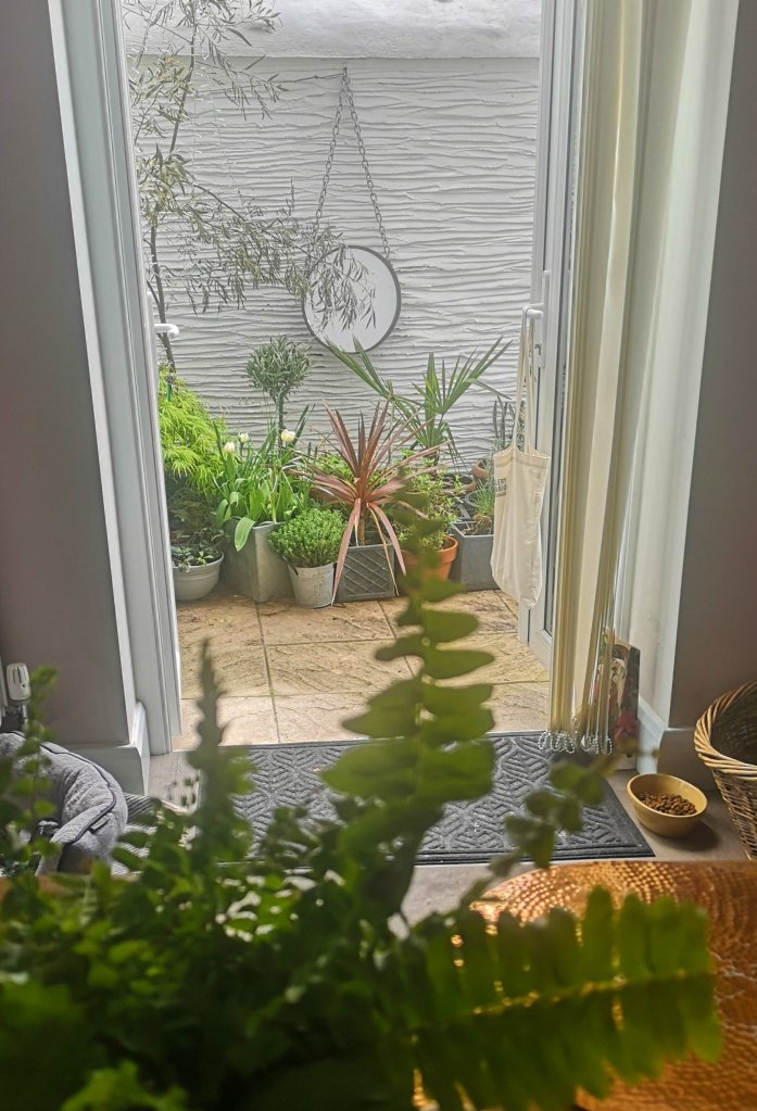 This is the most common view for writing a blog. Out of screen are a cup of tea, a notebook, a pile of clean washing, a Filofax ( oh yes I said Filofax ) and a lap top. All fairly normal dining room table flotsam and jetsam in a world that features working from home, Zoom meetings and family that live thousands of miles away. We are in mid April now and ten months into living in a house with a yard and not a garden. Container gardening is our new way of creating a green space. In the dark months of winter the plants in this view are decorated with fairy lights in an attempt to bring light into our lives through the french windows. Container growing has been largely a success, one moving casualty and one new plant that didnt make it through the winter. This morning I was struck by the random colour pairings that container planting creates. I had a bit of a spring move around earlier in the week. We have been much more succesful growing tulips in containers. Purple Sage and fancy tulips are not something we would have planned, but this pairing is lovely.