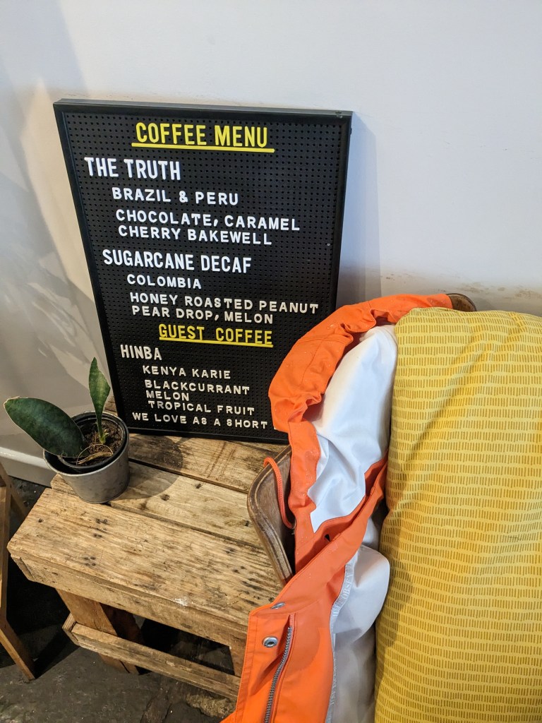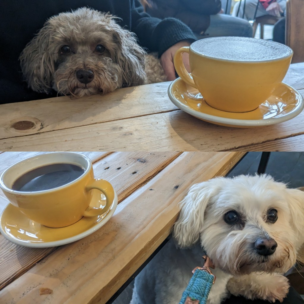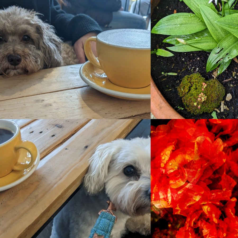Rather a greige weekend to report but there were colourful and opportunistic highlights. The coffee shop on our regular dog walk is very popular and there is rarely a chance to sit inside and shelter from inclement weather. The weather conditions frightened off most coffee drinkers and only the most hardy were out and about. A free table turned us to people and dogs who were ‘in and about.