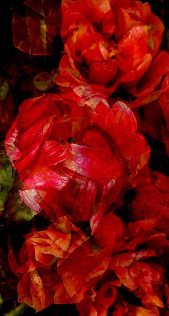 An entirely acceptable way to walk dogs in the rain. All the tulips on our walk were very woebegone, wet and droopy. Creating a double exposed image is a far more pleasing image to view than the poor drenched blooms were actually feeling.