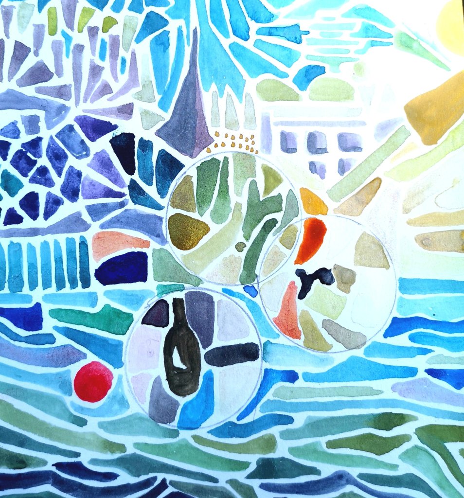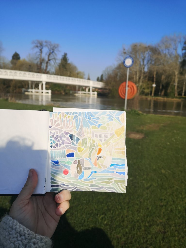 Fortunately my quick, abstract sketch/ colour note was of no interest to either of them, the swan honked a bit and wandered off, all too aware the sketch was inedible. The befuddled gentleman had no understanding of my visual Venn diagram, believing I think, that his inebriation was a good deal worse than he could have imagined. He was unaware he was not welcome in my picture and certainly not on my bench! The Venn Diagram was explicit, I thought.