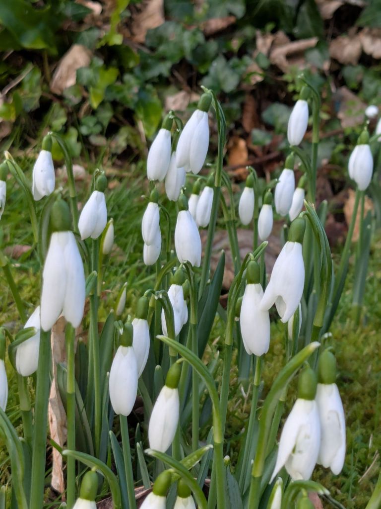 These clumps of snowdrops are usually much more open to posing for photographs. The green stripes of their underskirts are one of my favourite shades of green.